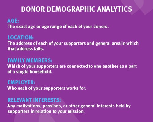 Demographic analytics are generally based on the following donor data points: