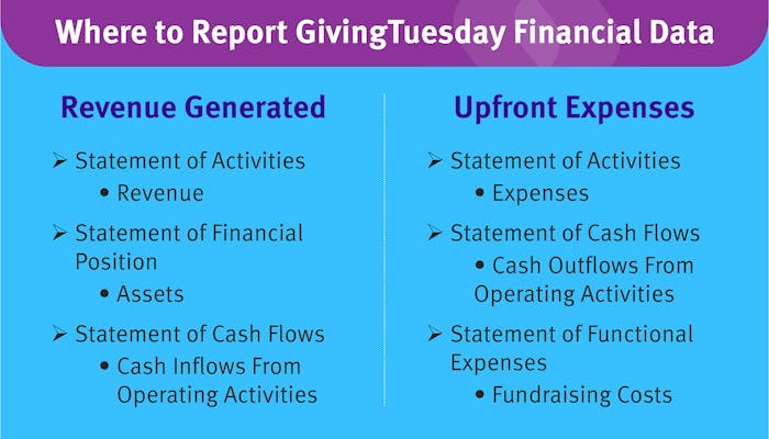Supporters aren’t the only external audience who want to see your nonprofit’s GivingTuesday data. You also need to report the financial information you collect to comply with legal requirements for exempt organizations and cross-industry accounting standards like the Generally Accepted Accounting Principles (GAAP). In particular, you need to include GivingTuesday information—both revenue generated and upfront expenses—in your annual financial statements.