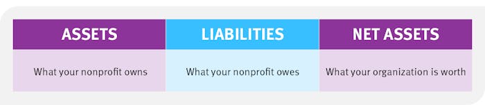The difference between your nonprofit’s assets and its net assets is that the term “assets” simply refers to everything your organization owns or controls, while “net assets” also takes into account your liabilities to show what your organization is actually worth. Anything your nonprofit owes—debt, payables, deferred revenue, etc.—is considered a liability.